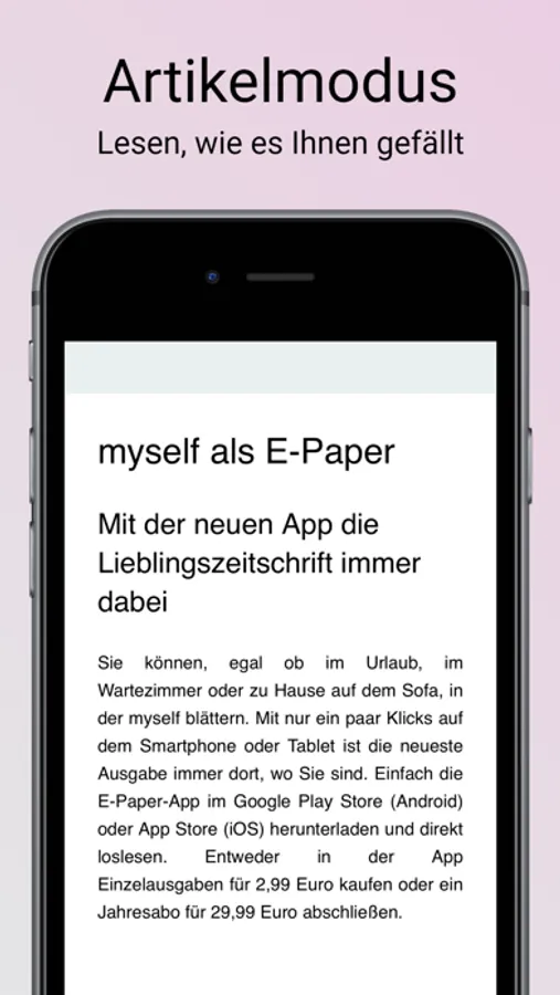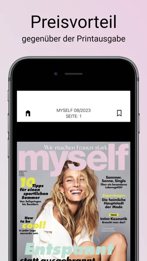 Mit der myself E-Paper-App gibt es auf einen Klick intelligente und entspannende Unterhaltung – überall und jederzeit abrufbar. Von exklusiven, hochwertigen Mode-, Beauty-, Reise-, Food- und Livingstrecken bis hin zu exzellent recherchierten Artikeln aus dem Bereich Gesundheit, Psychologie, Kultur/Lifestyle und Job. Das ganze Themenspektrum der Printausgabe also, das moderne, selbstbewusste Frauen interessiert.