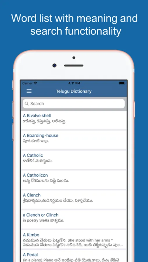 - We have a very Easy Interface to use, so everyone can use it simply without watching any tutorial. We worked hard to make everything easier to you. In the main screen, you will be able to see all words. There, you can type the english word that you are looking for and we will take care of finding the meanings of this word in Telugu language.