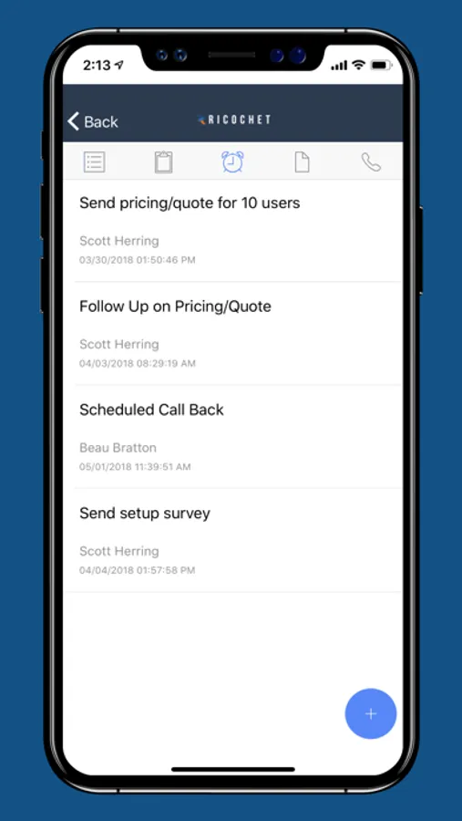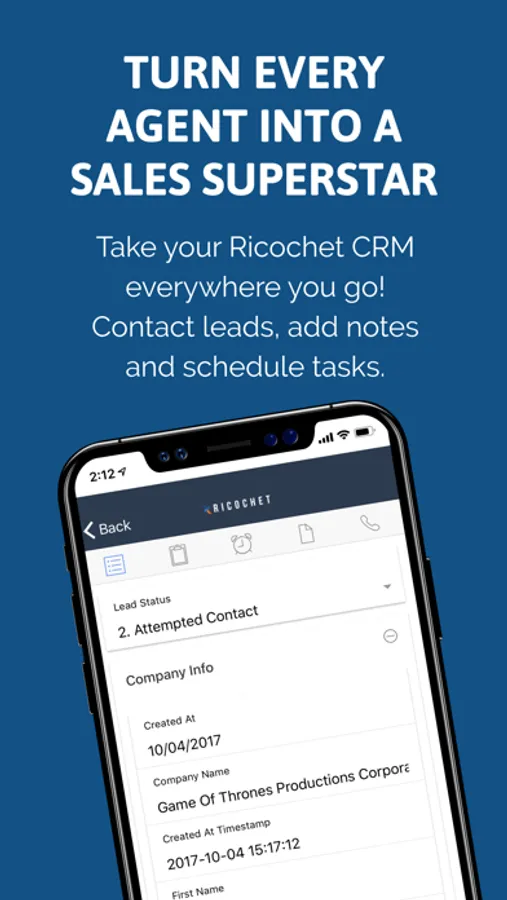 With Ricochet360 Mobile CRM, users can take and place calls, view and update lead information, and manage future tasks - providing quick and easy access to all available data at once.