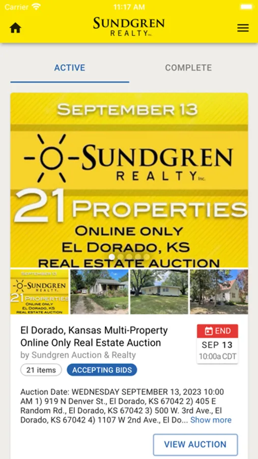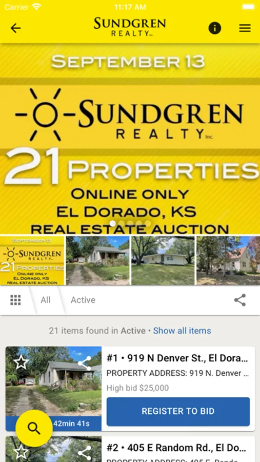 Welcome to the Sundgren Realty mobile bidding app! This dynamic app allows you to (1) stay informed about our upcoming auctions; (2) watch properties that interest you; (3) get notifications when you’ve been outbid; (4) bid no matter where you are located (or set and forget your maximum bid to let our platform automatically bid the lowest possible winning bid for you). This is the go-to-source for up-to-the-minute information on all of our auctions.
