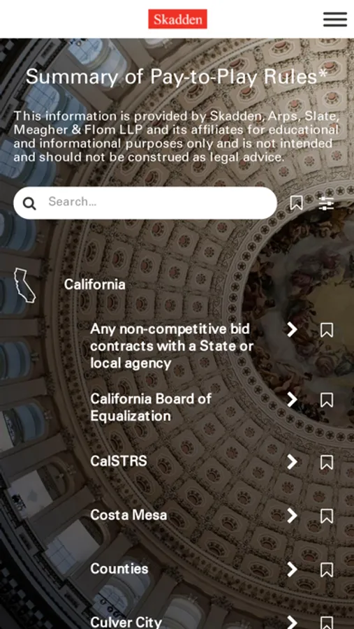 The app also includes an extensive library of reference materials covering lobbying, campaign finance, gifts and entertainment and pay-to-play laws.