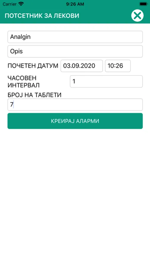 • Се пополнуваат податоци за лекот, датум и часот од кога се почнува со конзумација, на колку време и број на таблети