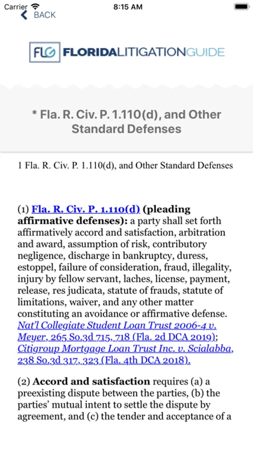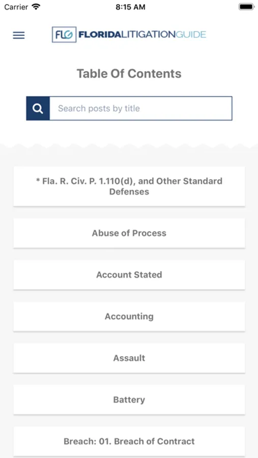 The Florida Litigation Guide is an invaluable online tool for litigation and transactional attorneys. The Guide provides for more than 70 common law causes of action (1) Each action’s elements; (2) The most recent state and federal cases that cite the actions’ elements; (3) links to the case law cited in the Guide, (4) The applicable statute of limitations for each action; and (5) Defenses to each cause of action. The App will allow lawyers to use the Guide on and off-line, while at their desk, in court, or on the go.