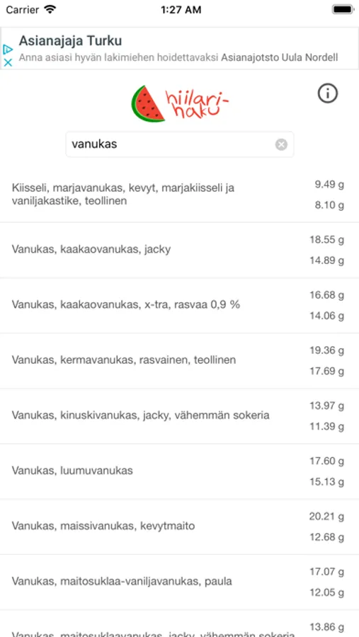 Hiilarihaku tekee elintarvikkeiden hiilihydraattipitoisuuksien ja sokeripitoisuuksien hakemisesta helppoa.