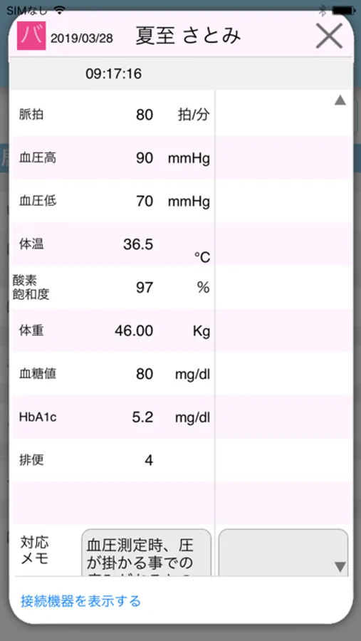 特徴として、専用の測定機器、[体温計(非接触型)、血圧計、血中酸素飽和度計]は同時測定が可能で、
