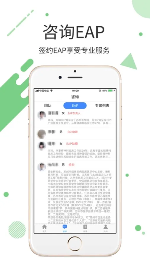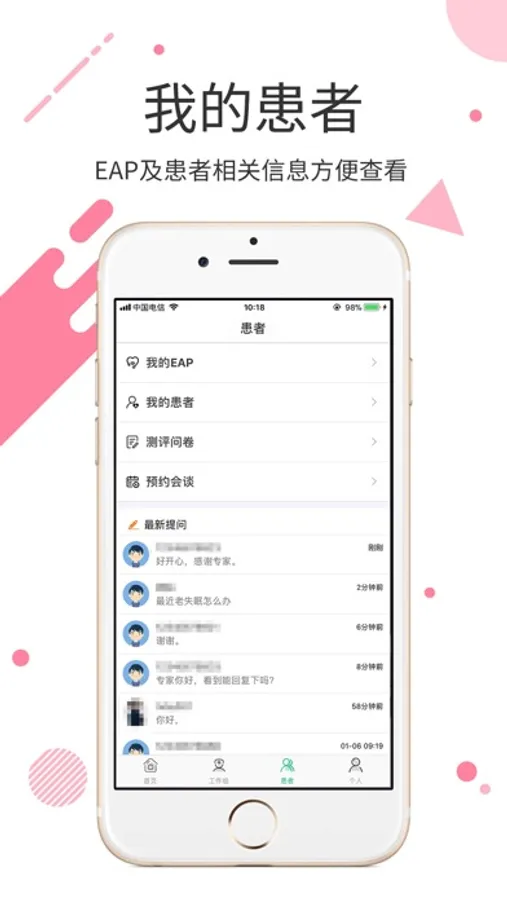 心理云平台APP集患者端、医生端于一体。患者端将心理自测、专家咨询、心理电台、课程学习、社区问答、疾病百科、用药提醒等功能集合,让患者享受更全面、更优质、更高效的医疗服务;医生端将患者管理、预警监测、问卷随访、心理电台、社区问答、医生圈、课程学习、文章发表等功能集合,实现高效的院内沟通和便捷的医患交流,拉近与患者的距离,是医护人员的好帮手。