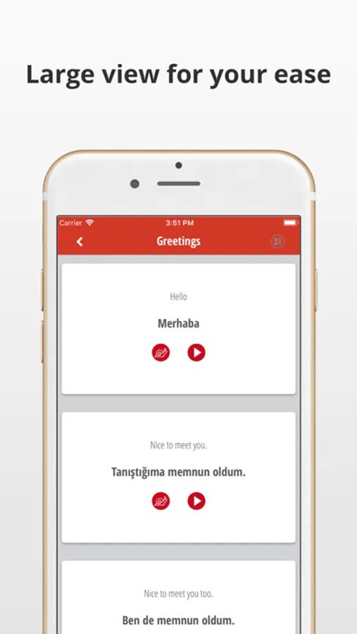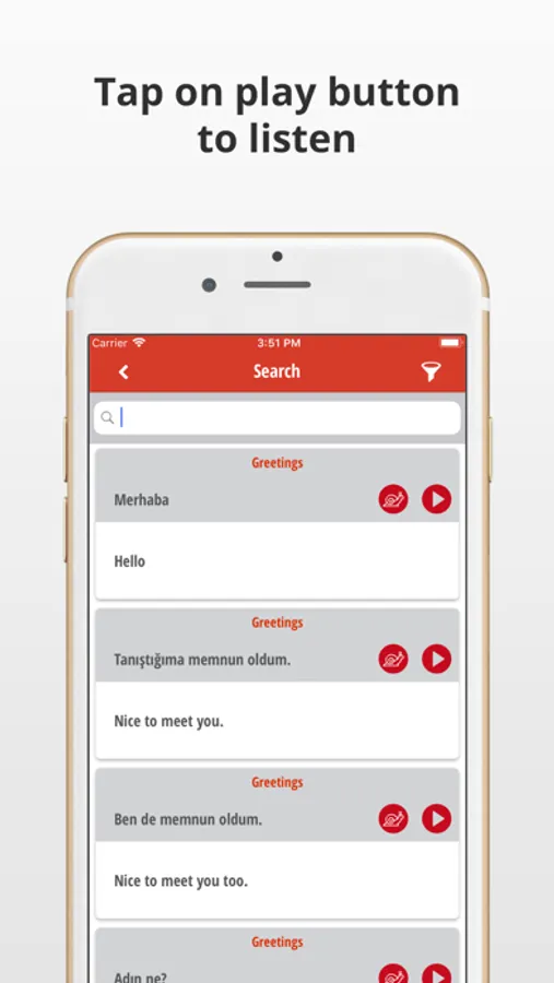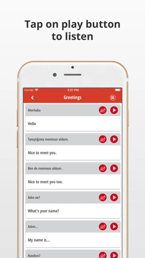 All the phrases in the app are given in English to Turkish. The availability of English to Turkish translation makes Turkish learning easier.