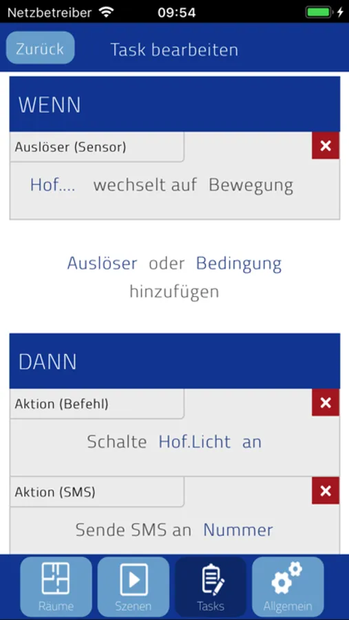 Frei konfigurierbare Tasks lassen sich einrichten. Wenn z.B. Bewegung im Flur erkannt wird, schaltet sich Licht im Flur an. Es können auch Tasks erstellt werden die nicht nur schalten, sondern Sie über E-Mail, Push-Nachricht oder SMS bei einem neuen Event benachrichtigen, . Passen Sie Ihr Haus einfach an Ihre Alltagsgewohnheiten an.