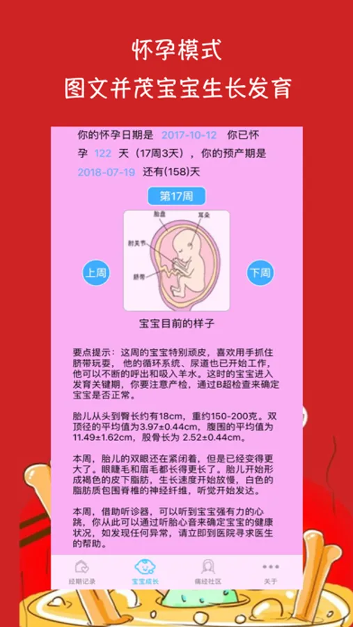 怀孕模式,图文并茂显示当前宝宝的生长发育情况。