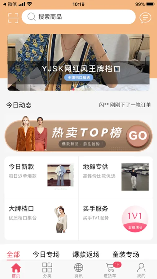 服装货源交易平台:为服装零售商(包含实体零售店、代理商、二三批批发商、网店卖家、微商卖家、抖音等自媒体创业者)提供原创设计、款式好、质量好、高性价比的一手源头服装货品,平台从服装源头(原创设计ODM/OEM供应商)大宗采购,保持价格优势,买手每周从6万款中严选上新,成为互联网服装批发一批平台;
