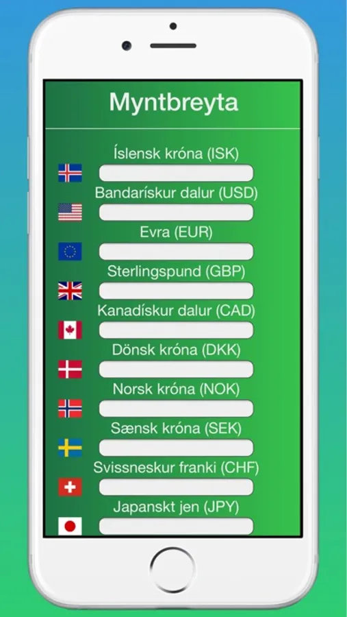 Einfalt app sem sýnír þér muninn á gjaldmiðlum.