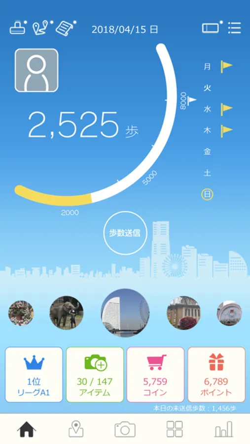 ホーム画面の送信ボタンをタップすると、歩数データが送信されます。また、1日1回、初回送信時にアプリ内で使用できるコインが獲得できます!
