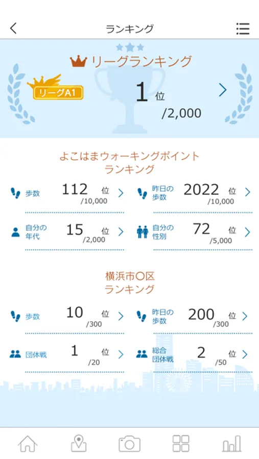 年代、性別、歩数等に応じた8種類のランキングで、自分の順位が簡単にわかります。