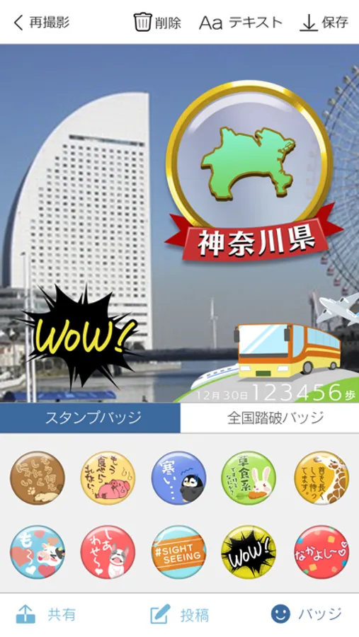 歩数等に応じて獲得したコインを、自分の好きなバッジに交換することができます。多くのバッジを獲得して、撮った写真をデコレーションしよう!各種SNS(Facebook、Twitter、LINE、Instagram)への連携も可能です。