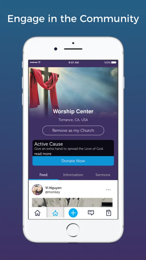 • Add and create media content including photos, videos, and slideshows where you can add customized features including a bible verse, commentary, captions/hashtags, and/or a song to the media content. You can even tag your friends!