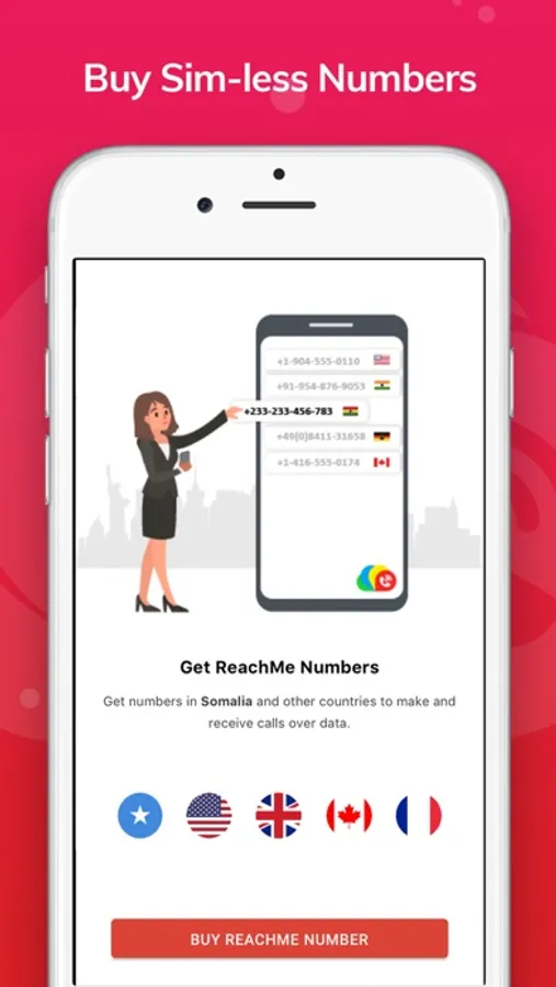 With ReachMe Numbers, buy a SIM-Less number from Somtel Somalia, USA, UK, France or Canada.