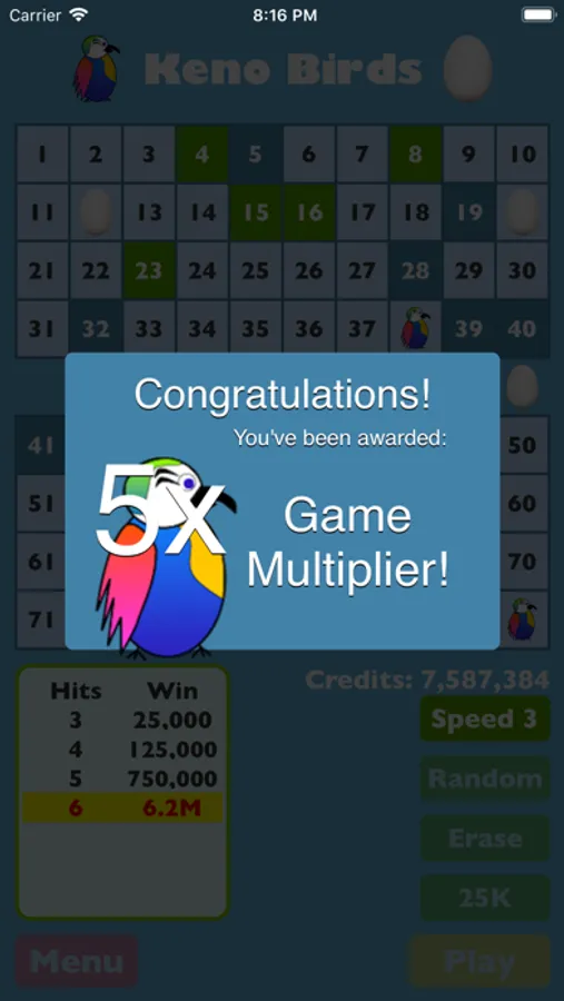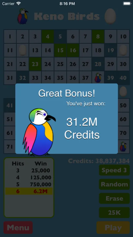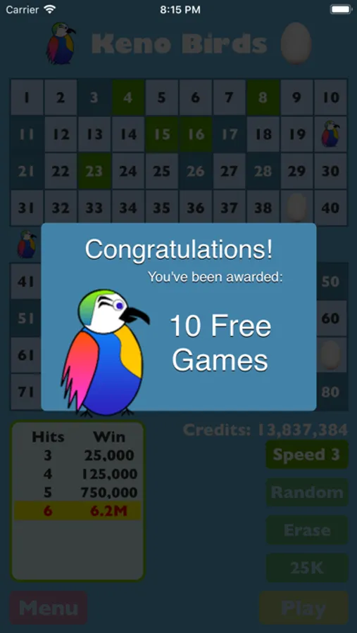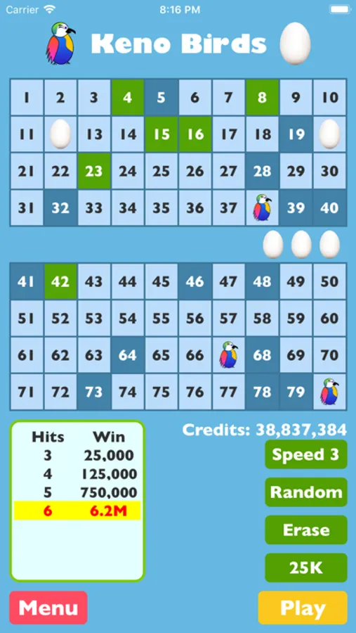 An exiting and cute bird-themed keno game with bonus free games and multipliers! Fair random play with no manipulative algorithms! No internet required and no in-game advertisements.