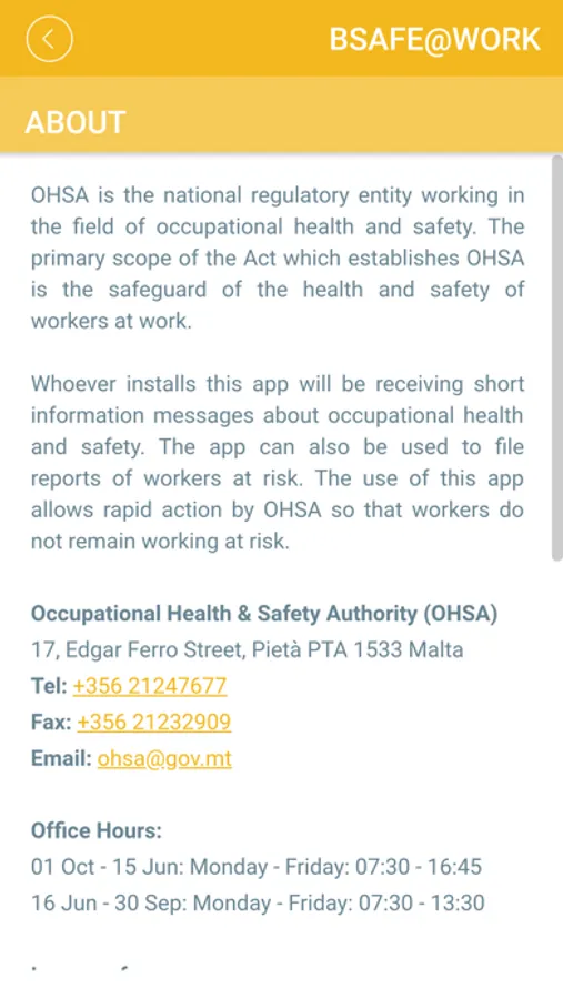 Is-Saħħa u s-Sigurtà fuq il-Post tax-Xogħol għandha d-dmir li tiżgura li l-livelli ta' ħarsien tas-saħħa u s-sigurtà fuq il-post tax-xogħol jinżammu, kif stipulat mil-liġi. Dan il-proġett se jgħin lill-OHSA fl-operazzjonijiet tiegħu billi jipprovdi lill-pubbliku ġenerali metodu aktar faċli biex jissottometti rapporti u/jew ilmenti, kif ukoll jinnotifika lill-utenti bl-aħħar informazzjoni.