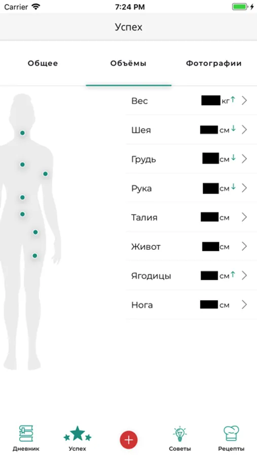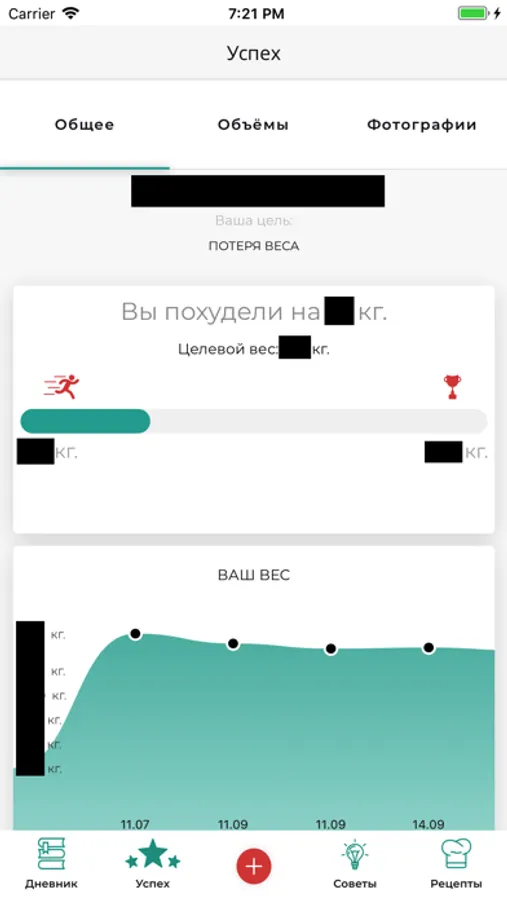 Также вы сможете отслеживать прогресс с помощью фотографий и интерактивных графиков изменения веса и параметров тела.