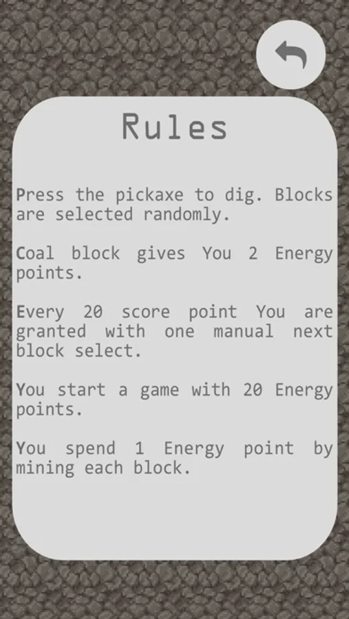 Create deep mines and take coal from them. This game balances between randomness and ability to think. Stay alive and help your miner to find coal which supports his strength. Use your bonus block selections to prolong the game.