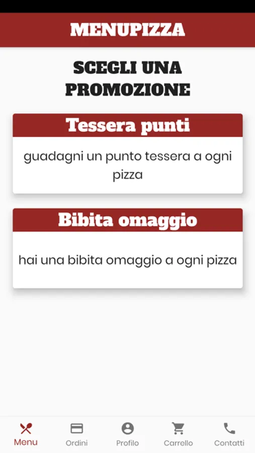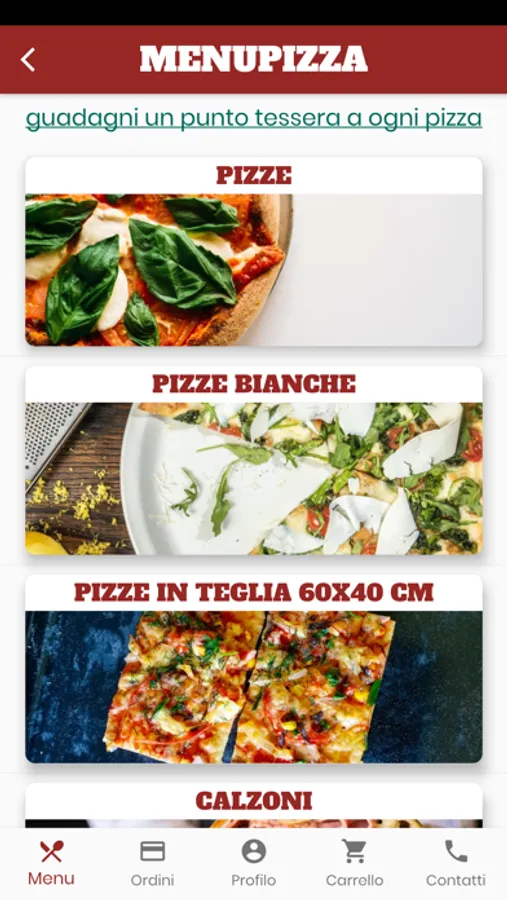 Scarica l'app gratuita Menupizza e sfoglia il nostro menù direttamente sul tuo cellulare. Con l'app Menupizza puoi pagare in contanti alla consegna o con le principali carte di pagamento in fase di ordinazione. Inoltre, con ogni pizza ordinata, oltre alla promozione "Una bibita in omaggio", raccoglierai punti sulla tessera fedeltà, ogni 10 pizze riceverai uno sconto equivalente al costo di una margherita!