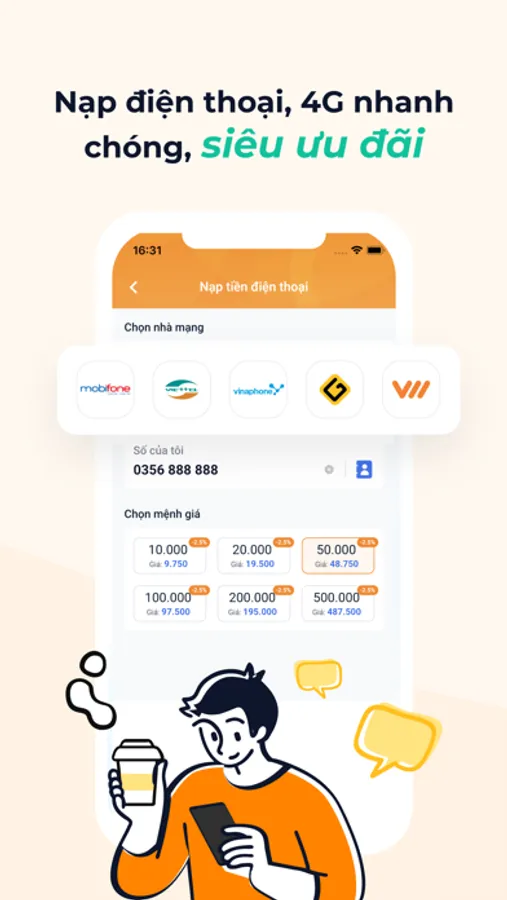 Nạp tiền và mua thẻ điện thoại các nhà mạng Vinaphone, Mobifone, Viettel, Vietnamobile, Gmobile, nhanh chóng và tiện lợi chỉ trong vài bước. Đặc biệt hấp dẫn với chiết khấu cao lên đến 4.4% và các chương trình khuyến mãi.