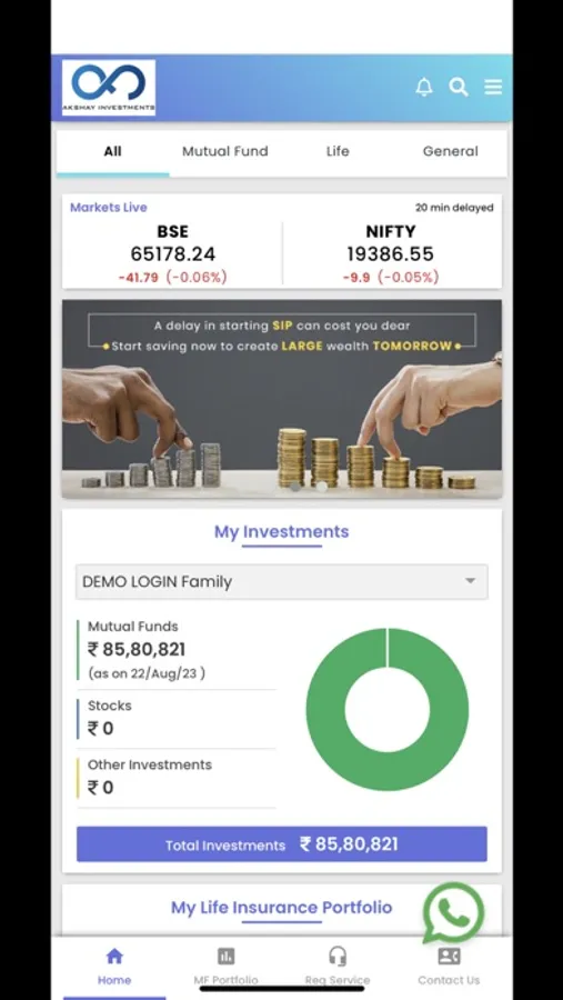 Akshay Investments is a state-of-the-art investment & insurance portfolio management App for customers with Akshay Investments App, you can get several views of your portfolio which will not only keep you abreast about its latest status, but also help you making important decisions for investment re-balancing, profit booking or stopping loss.
