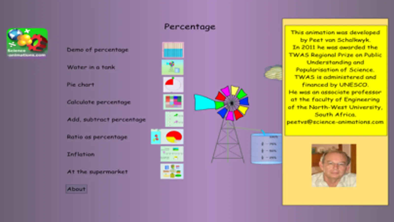 The Science Animations: Percentage Animation app is for learners in secondary schools. Learners will learn how to apply percentage calculations in various applications.