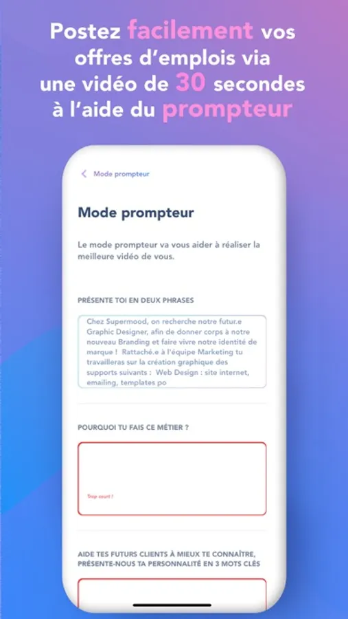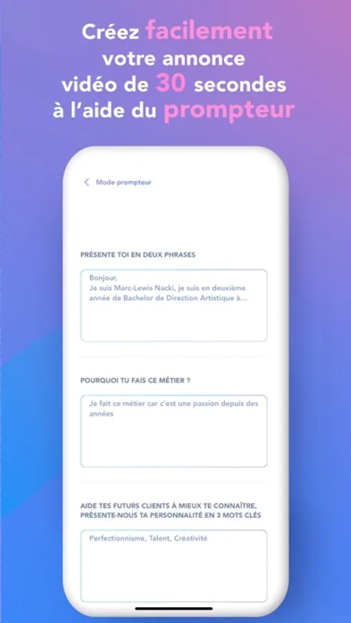 Sur une seule plateforme, vous pouvez présenter vos services, votre activité ou votre CV à l'aide d'une vidéo courte de moins de 30 secondes. Réalisez votre meilleure Pop Annonce sur l'application grâce au Mode Prompteur mis à votre disposition pour que vous puissiez préparer votre discours en amont de la captation.