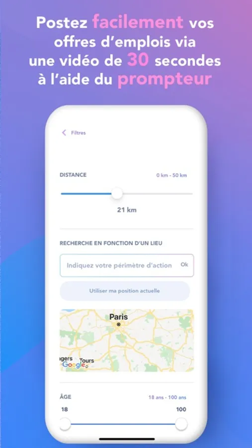 Sur notre application mobile, vous accédez à un défilement d'annonces et de CV vidéo ainsi qu'à des offres d'emploi vidéo, en un clic sur des catégories classées par types de métier, présentées sous deux pages d'accueil différentes : recrutez en vidéo & postulez en vidéo.