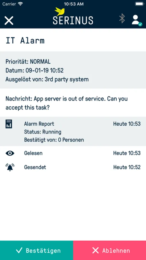 The alert app makes it possible to connect mobile user to the Serinus alert and crisis management platform. According to a defined set of rules, Serinus transmits notifications quick and reliable to the required persons and teams.