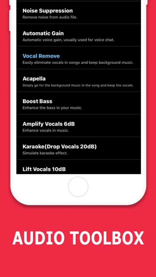 • Audio toolbox. Currently supported features include enhanced vocals, vocal removal, noise cancellation, automatic gain, accompaniment removal, bass boost, karaoke, etc.
