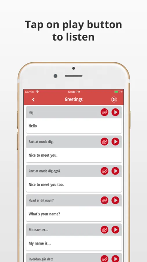The app will allow you to discover commonly used phrases in Danish language and enhance your reading, writing, listening and speaking skills. You will feel like you have your own Danish tutor in your pocket at all times.