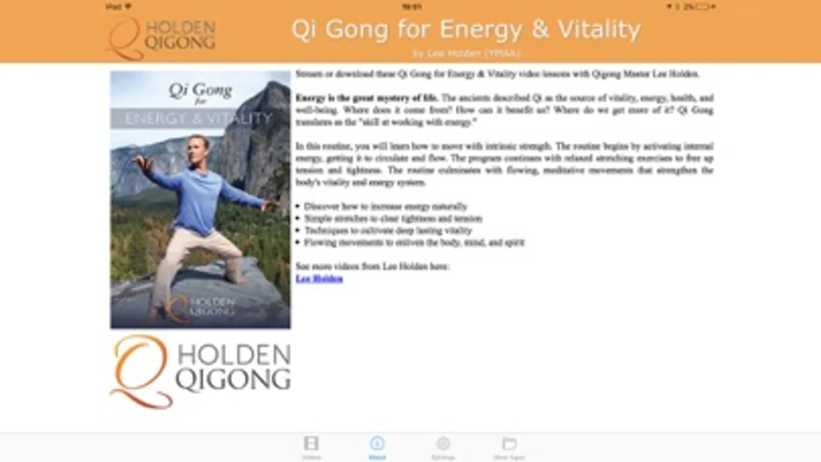 Stream or download these Qi Gong for Energy & Vitality video lessons with Qigong Master Lee Holden. Small file size, free sample videos, and a single IAP to unlock all content.