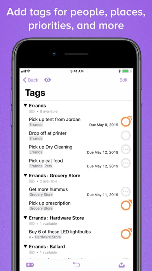 • NEW: Tags add a powerful additional organizing tool. Create tags for person, energy level, priority, location, and more.