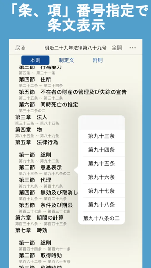 ●豊富な条文表示機能。指定条文の素早い表示ができます(例:「98条の2項は」の確認など)