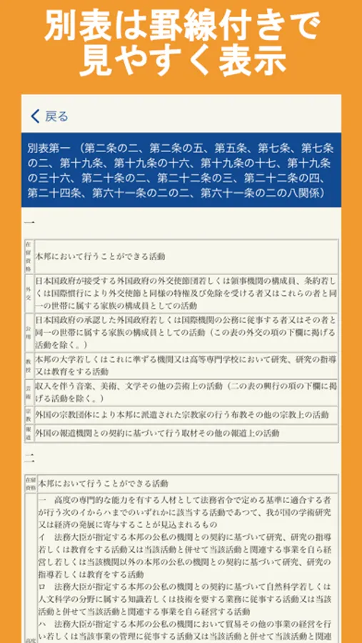 - 附則、別表など分離して表示するので別表も素早く表示できます