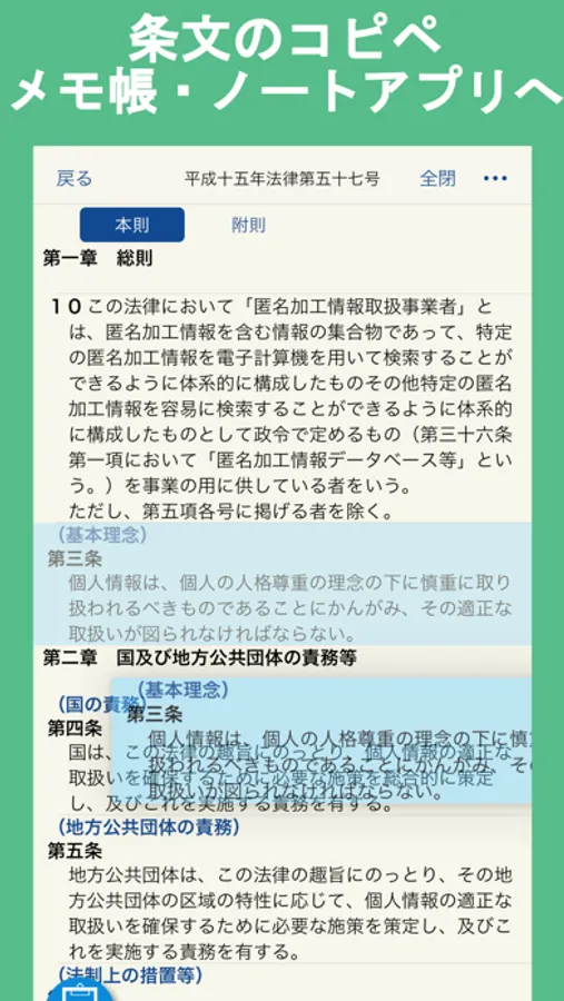- 条文のコピー&ペーストが可能(ノート作成やメール・SnSへの投稿などが簡単)