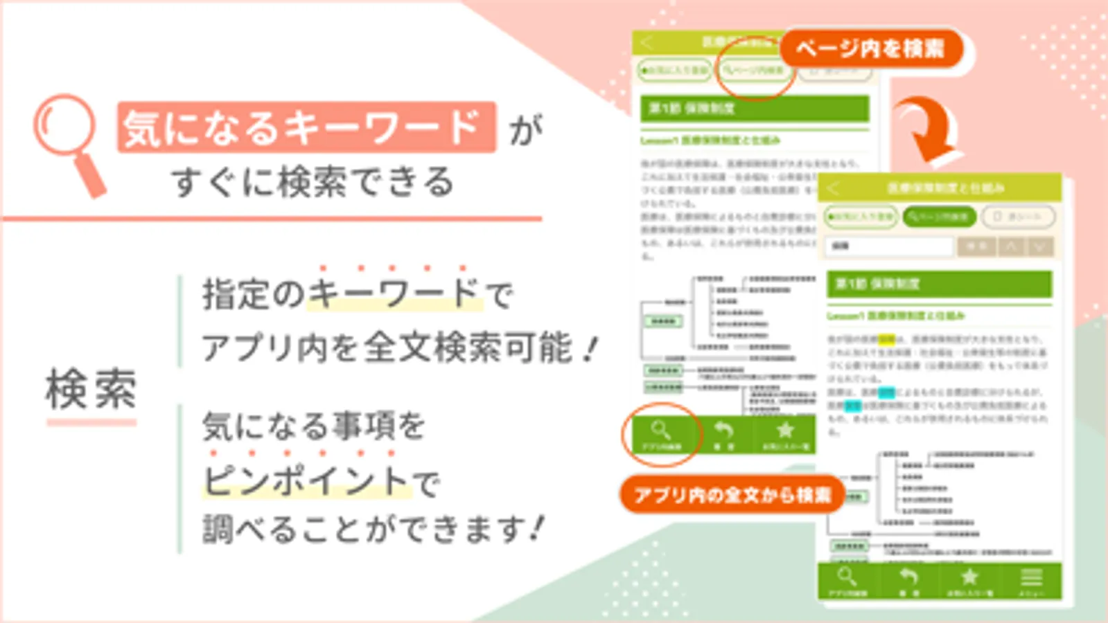 ご指定のキーワードでアプリ内を全文検索!気になる事項をすぐに調べることができます。