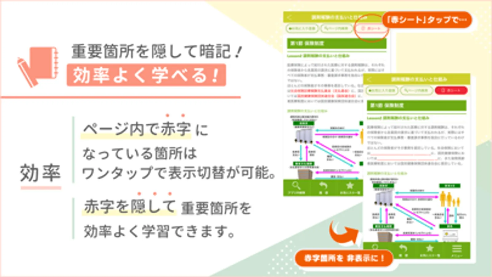 ページ内で赤字になっている箇所を消したり出したりすることで、効率的な暗記を支援します。