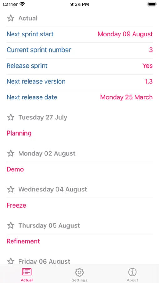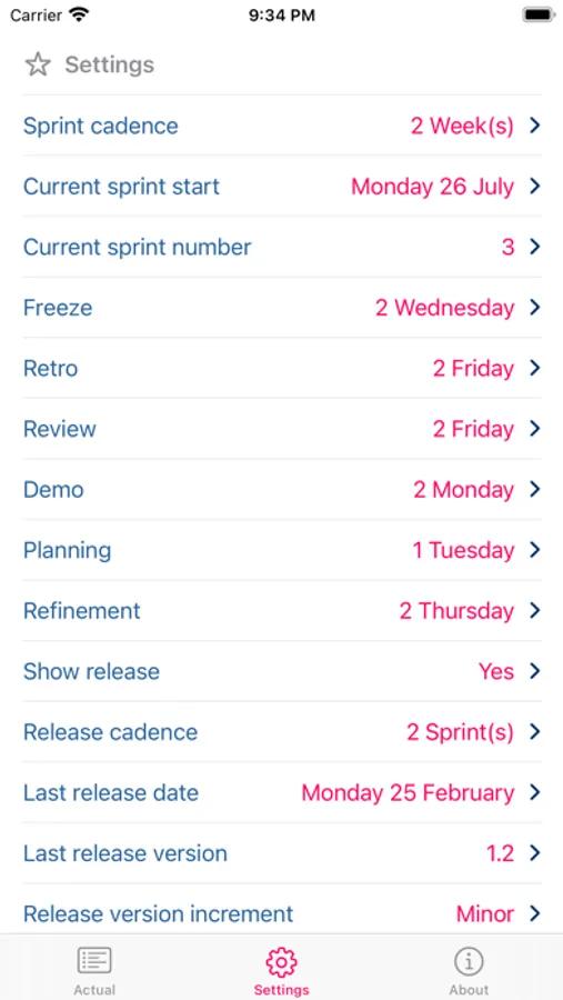 Keeping track of scrum ceremonies and release dates has never been easier! Configure the cadence and the ceremony days once, and always have an overview of upcoming events at hand.