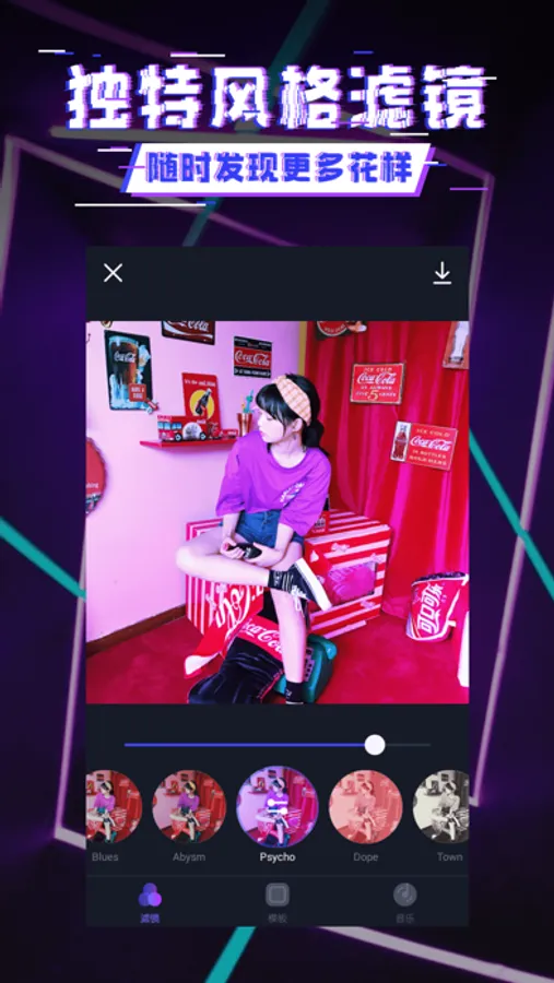 多种风格滤镜,任何一张图片都可以找到合适的精美滤镜,让图片从一开始就美化,再搭配动感相机里自带的动态模板,生成你的高质感大片。