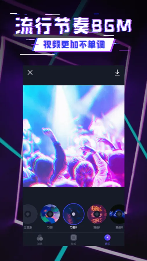 精心挑选多种律动BGM,动态效果与音乐节拍完美匹配,为视频增加节奏感,让你的小视频一点都不单调。