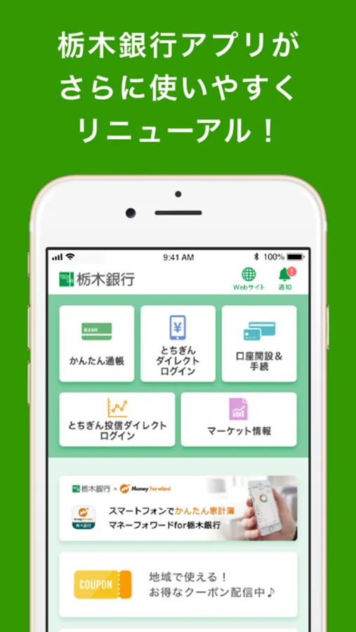 栃木銀行からの各種お知らせやキャンペーン情報、地域のクーポン情報を確認できるアプリです。