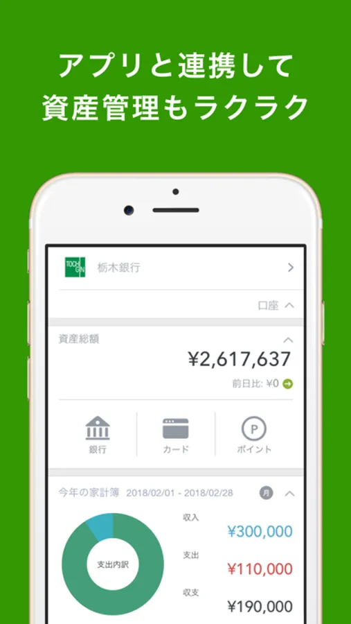 栃木銀行アプリは「かんたん通帳アプリ」と「Money Forward for栃木銀行」と連携して口座明細・残高 や家計簿の確認ができるほか、「口座開設&手続き」アプリとも連携し、口座開設の申し込みが利用いただけます。