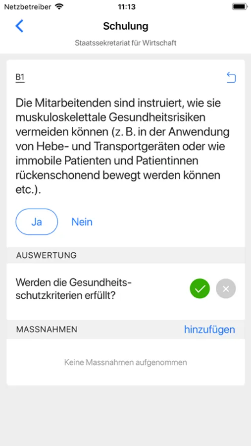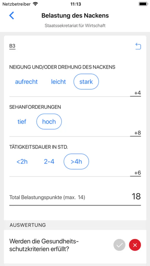 Das Prüfmittel definiert Gesundheitsschutzkriterien für wichtige Aspekte der Arbeitsplatzgestaltung und bewertet Arbeitshaltungen und -bewegungen für die fünf Körperteile Rücken, Nacken, Schultern/Arme, Hände, Hüfte/Beine.