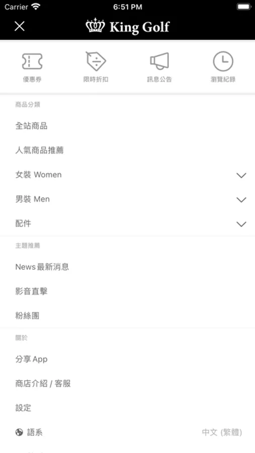 KING GOLF官方APP不定時推出限定優惠!APP會自動推播訊息,讓你不再錯過任何好康活動。KING GOLF強調機能舒服的布料材質,呈現優雅俐落身形剪裁,這是我們對於品味的堅持~