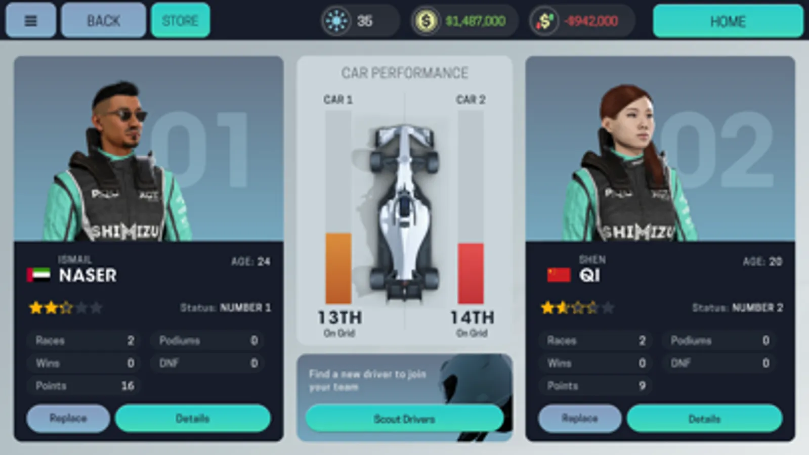 • This is your racing team. Hire drivers, develop your car and invest in technology.