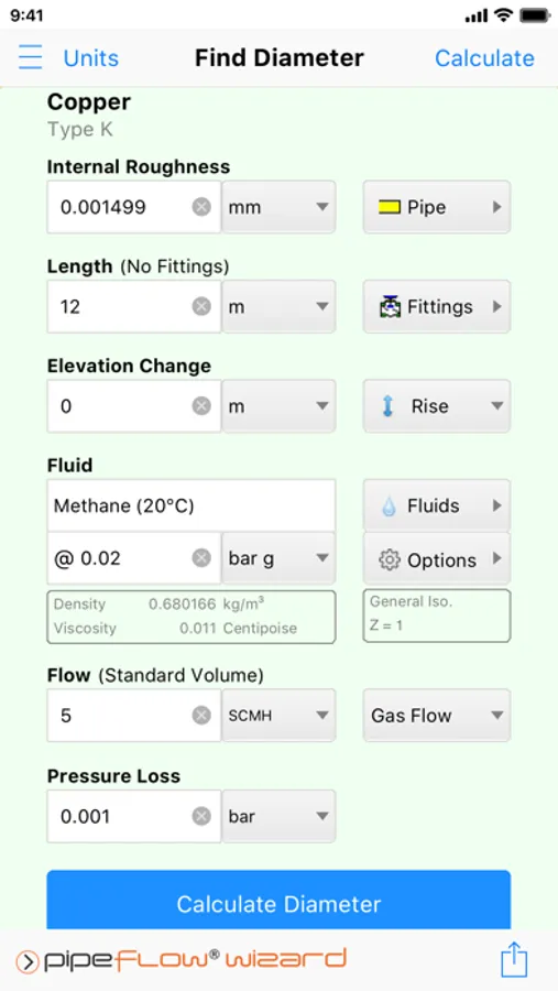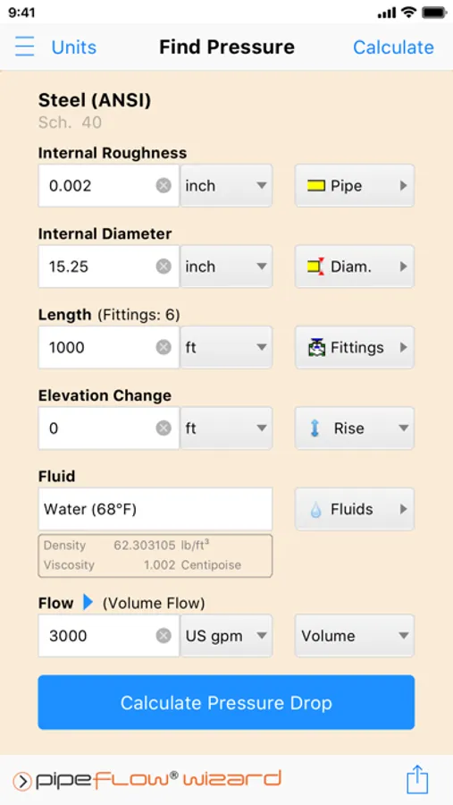 Pipe Flow Wizard is a fluid flow rate and pressure loss calculator app from Pipe Flow Software. Perform flow rate calculations, calculate pressure drop in a pipe, size a pipe diameter, or calculate a maximum pipe length for a given flow rate at an allowed pressure loss.