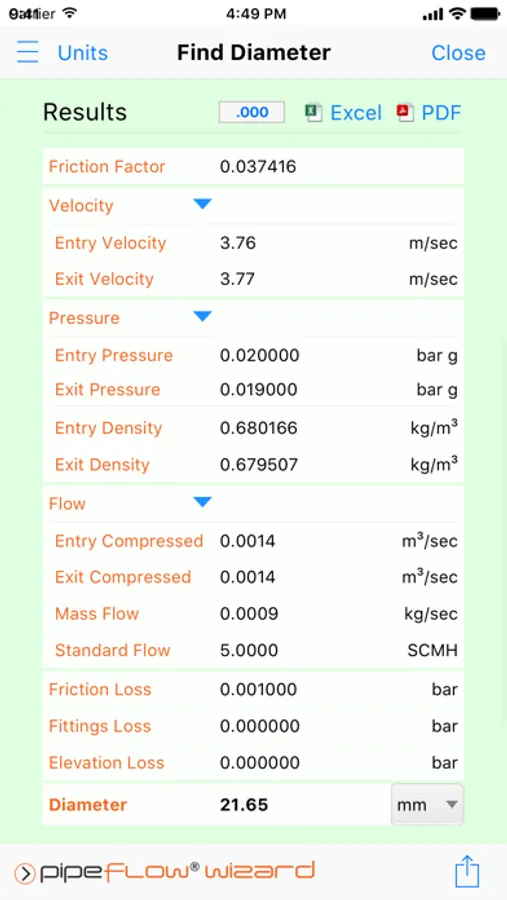 The Pipe Flow Wizard App makes it easy for pipe system engineers to perform flow rate and pressure drop calculations, where the calculation results can easily be shared as an Excel or PDF Report. Calculations can also be saved to the iPhone or iPad and data files can be shared with other users of the software on either macOS or Windows.